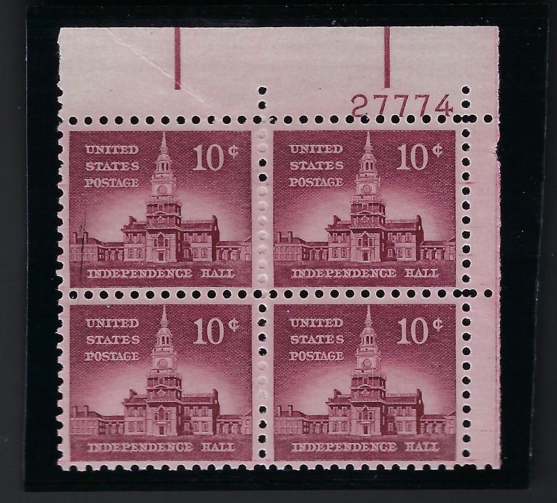 *1044d, RARE PL#, NEVER HINGE Product Description 10 CENT INDEPENDENCE HALL "Tagged" Plateblock Upper Right PLATE #27774 Very Fine, Never Hinge Minor Crease ______________________________________________________ ... Read More
