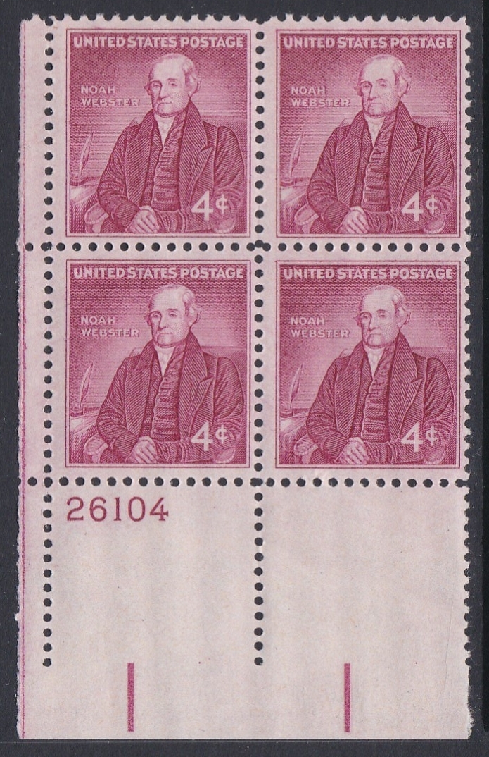1121 Noah Webster Plate Block MNH
