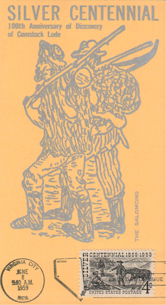 #1130 Silver Centennial maximum card first day cover by The Salomons. Postmark State: NV City: Virginia City Year: 1959 Month: 6 Day: 8