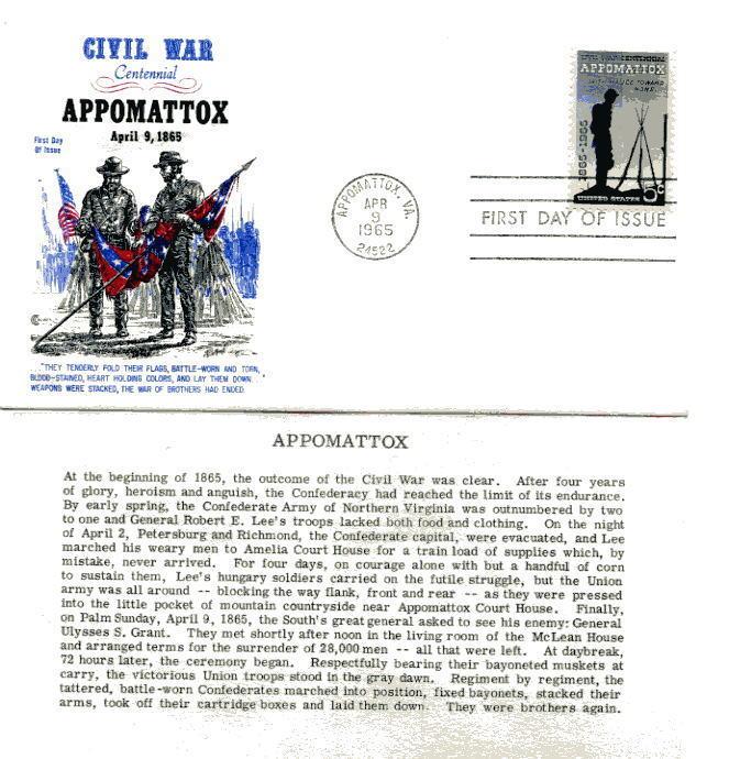 Grade: VF (Very Fine)#1182 5c Civil War Centennial, Appomattox, unaddressed Cover Craft Cachets, with insert, first day cover, Apr 9, 1965, Appomattox, VA.The scan is of a typical cover. Combine purchases to save on shipping charges.