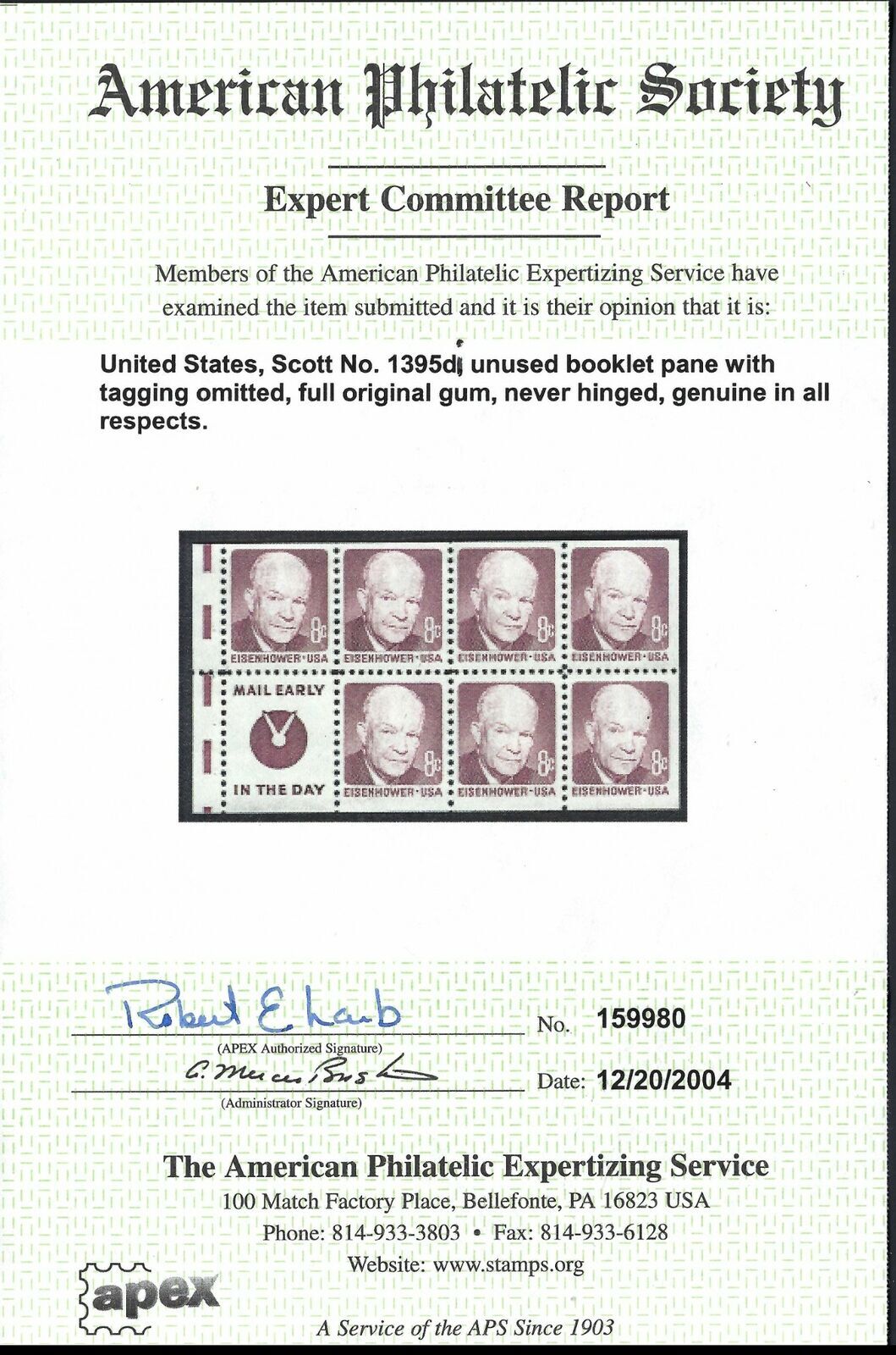 Grade: SEE DESCRIPTION*1395i, SUPERB, NEVER HINGED, CERTIFICATE Product DescriptionBOOKLET PANE OF 7 PLUS LABELdull gumTAGGING OMITTED (LISTED BUT UNPRICED IN SCOTT)EXTREMELY RARE!AMERICAN PHILATELIC SOCIETY CERTIFICATE______________________________________________________________________________________________________________________________All stamps, collectibles and other items are guaranteed sound unless otherwise noted in the description.Stamps are original or no gum, as used, unless otherwise indicated.Stamps are considered hinged unless noted as NH (Never Hinged)You may notice some blurring in photos due to the plastic protector reflecting off the light in the scanner. We mail out our shipments on Tuesday and Friday mornings (not including holidays.) Lots purchased late on Fridays will be shipped the following Tuesday (not including holidays). Since the U.S. Mail has been less than stellar lately, please allow more time for deliveries.We are one of the largest companies in the United States, specializing in the sale of U.S. and Worldwide Stamps. Our parent company is in good standing with ASDA and APS since 1973.We are open Tuesdays through Saturdays. However, we can still communicate with you via cellphone emails. So, if you have any questions, please do not hesitate to contact us and you should receive a prompt reply.Payment TermsAuction: Payment through PayPal to be received and collected within four (4) days of end of auctionBuy It Now: Payment through PayPal to be received immediately after purchase. However, if there needs to be a revision of the price to include foreign shipping cost, once that is done, then immediate payment is required.Shipping Terms:Free shipping in U.S. Only, When OfferedInternational: As per Hip protocolPlease allow 3 business days (not including holidays, weekends, or Mondays) for your item to be shipped. Your favorable feedback is much appreciated. We will always be able to resolve issues you may have with an item you purchased.Thank You for your Patronage!