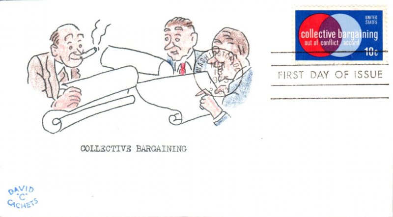#1558 Collective Bargaining first day cover by David C Cachets. The corners and left center edge of the cachet are creased. Postmark State: DC City: Washington Year: 1975 Month: 3 Day: 13Seller Information