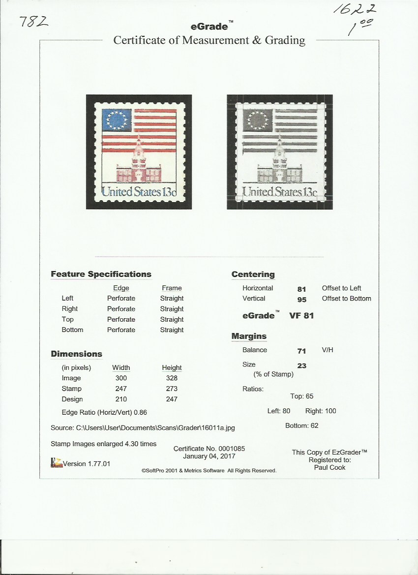 This is a centering grade only. P.S.E. May grade higher or lower. I ship the print out of ez-grader with the stamp. There are VF+ items through out ALL of my listings. These are simply the ones I noticed. The pictured U.S. postage stamp shows the stamp you will receive.Seller Information