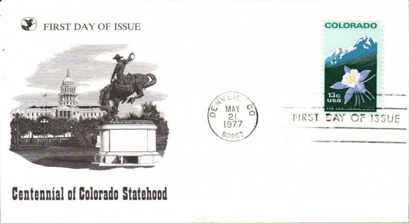 #1711 Colorado Statehood first day cover by Pegasus - Reader's Digest. The left edge and upper right corner are creased and there are staple holes n the upper left edge. Postmark State: CO City: Denver Year: 1977 Month: 5 Day: 21Seller Information