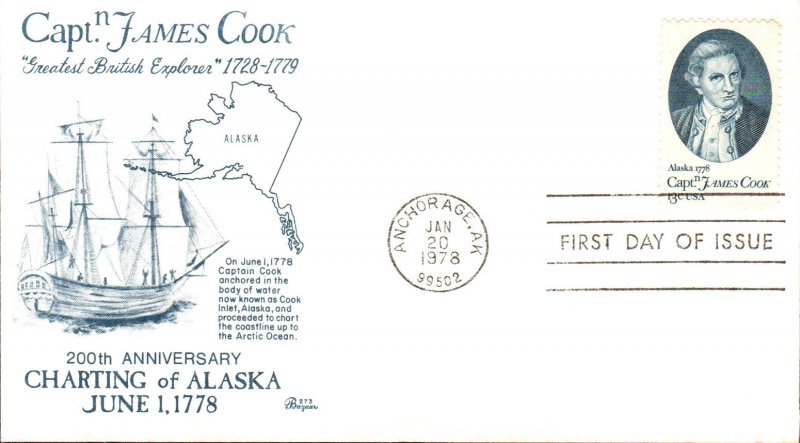 #1732 Captain James Cook first day cover by Bazaar. The lower left corner is creased. Postmark State: AK City: Anchorage Year: 1978 Month: 1 Day: 20Seller Information