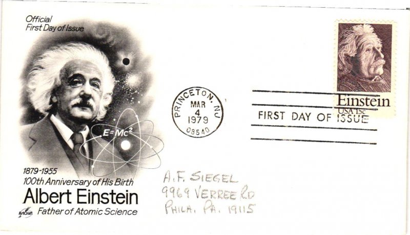Offered is a first day cover for #1774 Albert Einstein – Artcraft Cachet SC22 – addressed – addressee may vary – zoom in for condition - NOTE SCANNER MAY CUT OFF TOP OR BOTTOM OF CACHET IN SCAN ONLY. May have some foxing.Seller Information
