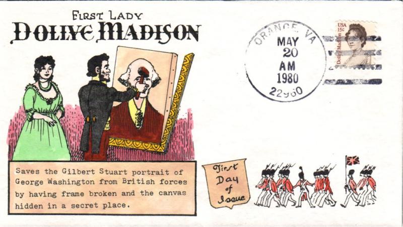 #1822 Dolley Madison first day cover by DRC Cachets. Postmark State: VA City: Orange Year: 1980 Month: 5 Day: 20Seller Information