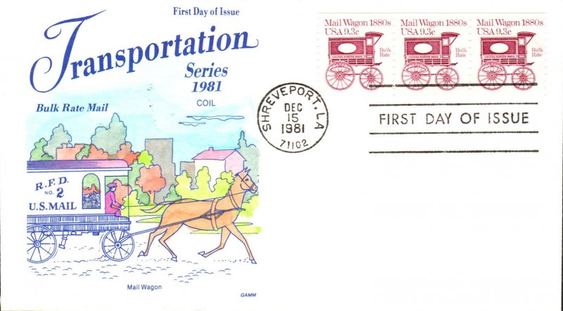 #1903 Mail Wagon 1880s first day cover by Gamm Covers - colored by H. I. Swindall. The upper right edge is creased and the edges are toned. Postmark State: LA City: Shreveport Year: 1981 Month: 12 Day: 15