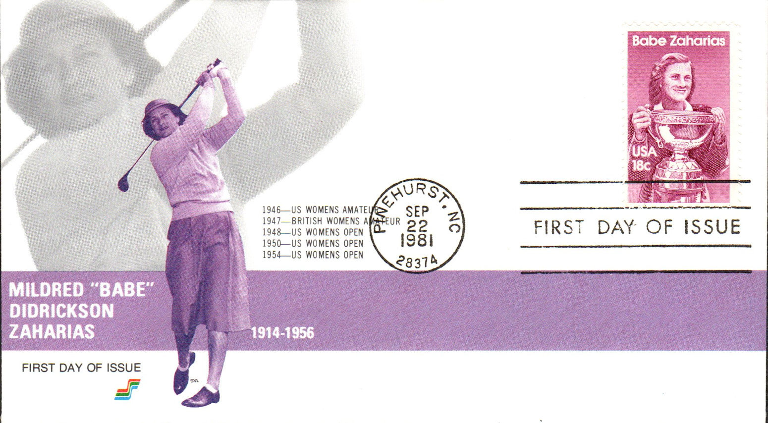 #1932 Babe Zaharias first day cover by Spectrum Covers. The lower left corner is creased. Postmark State: NC City: Pinehurst Year: 1981 Month: 9 Day: 22Seller Information