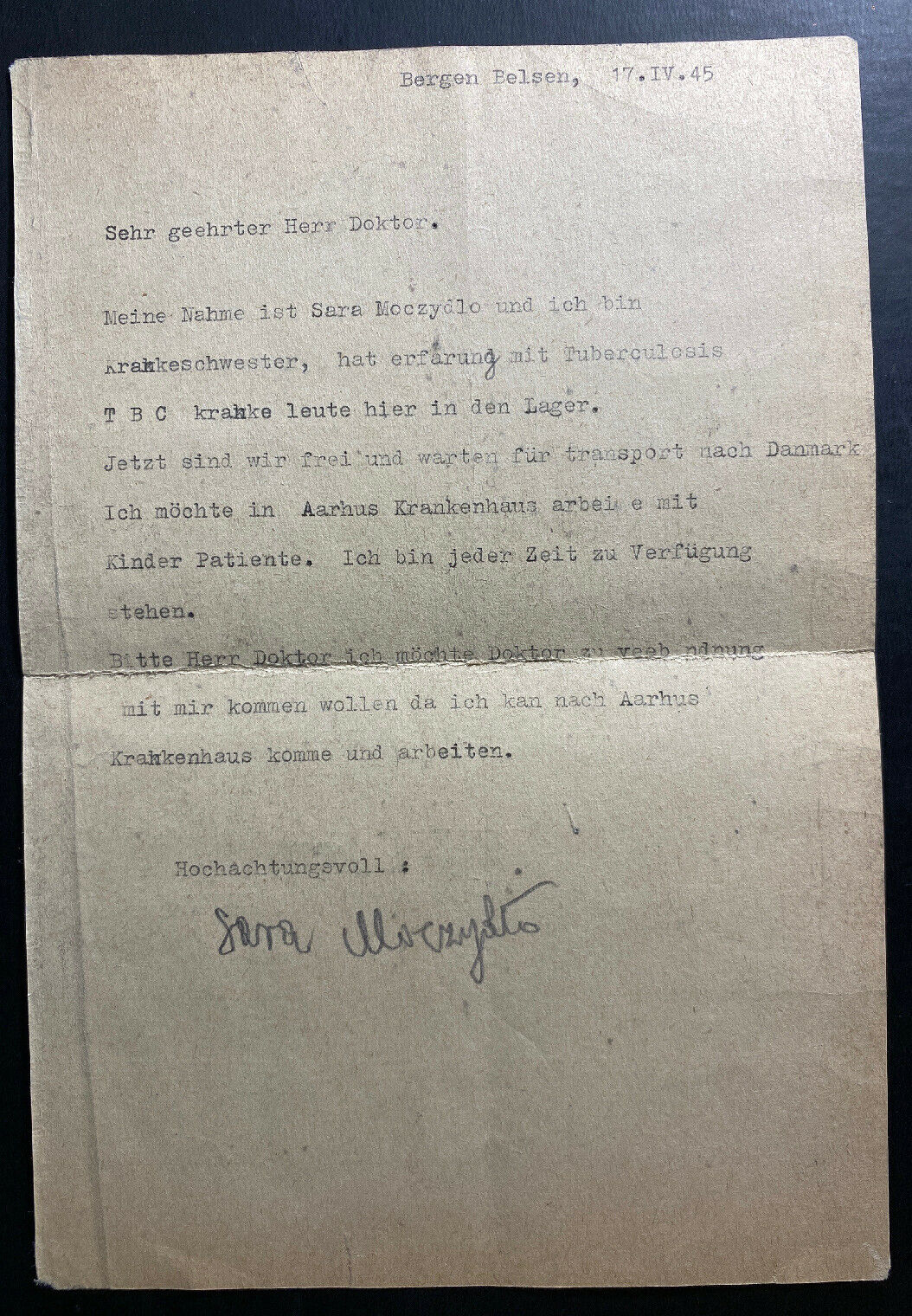 Up for auction is a beautiful censored cover from the concentration camp in Bergen Belsen Germany, the infamous former concentration camp, to Aarhus Denmark . Priced to sell. Postmark in April 17 1945. Great cancels and markings.Note that the cover is Cancelled in Berlin but the letter and the Address in the back says From Bergen Belsen. Original letter enclosed . Prisoner name is Sara Moczydlo.