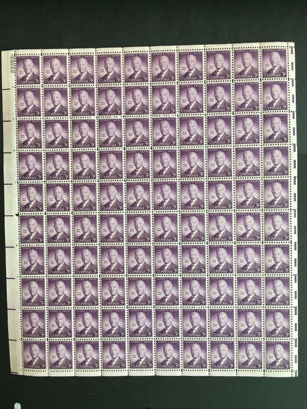 Full mint sheet of 100 - 3 cent stamps issued in 1945 to Honor Alfred E. Smith, the Governor of New York. The stamp shows a portrait of Smith. The picture below shows one of the stamps from the sheet. Except for som ... Read More