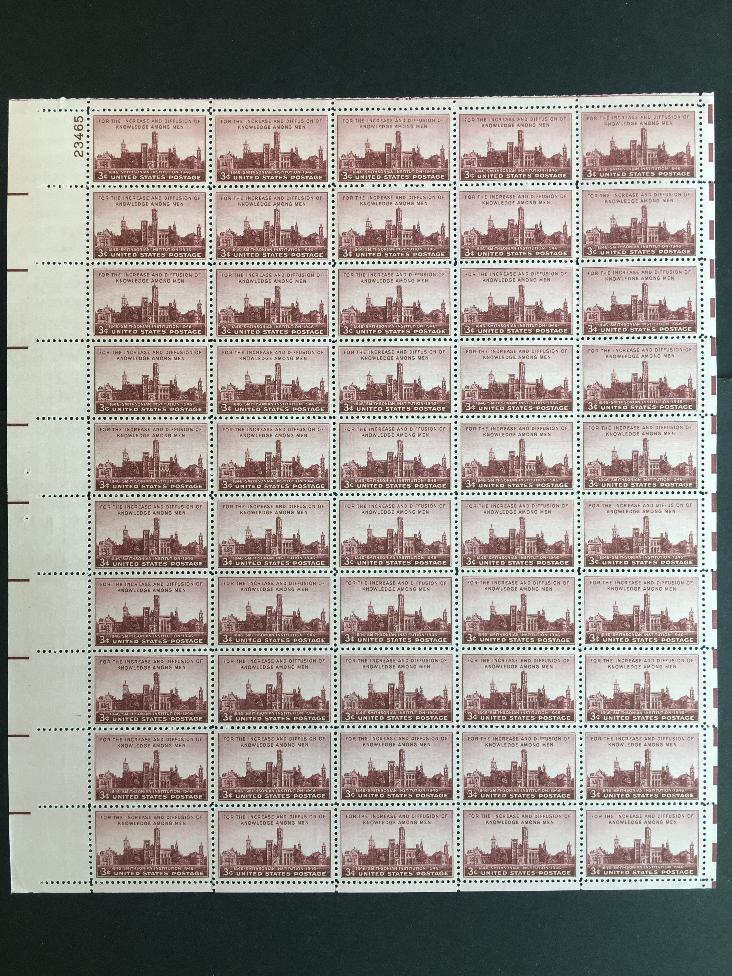 Full mint sheet of 50 - 3 cent stamps issued in 1946 to celebrate the 100th anniversary of the establishment of the Smithsonian Institution, Washington, D.C. The stamp shows a picture of the Smithsonian Building. Th ... Read More