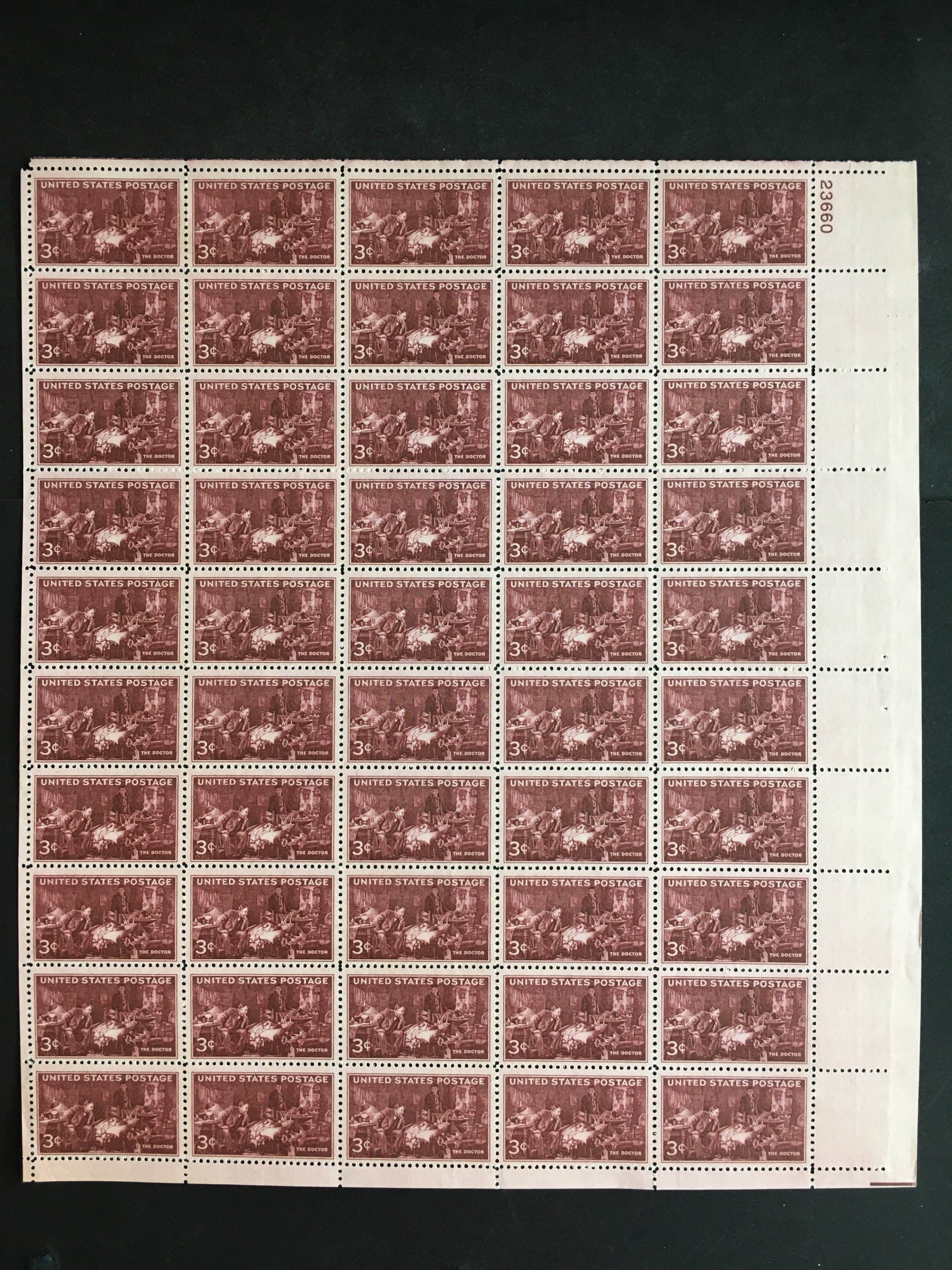 Full mint sheet of 50 - 3 cent stamps issued in 1947 to honor the physicians of America. The stamp shows an image from _The Doctor_ by Sir Luke Fildes. The picture below shows one of the stamps from the sheet. Except for a tiny missing corner of narrow selvedge, this sheet is as fresh as the day it was purchased at the post office 70+ years ago and is suitable for framing. What a great gift for the doctor in your family. If you're a stamp collector, it is Scott # 949. Plate # 23660 UR.For First Class, flat shipping with a stiff cardboard backing for mint sheets I charge a flat rate of $3.00 for items purchased with one payment and sent to US addresses. That covers as many sheets as you win, so bid on several and save on postage. For other items and International addresses, actual postage costs will be charged.