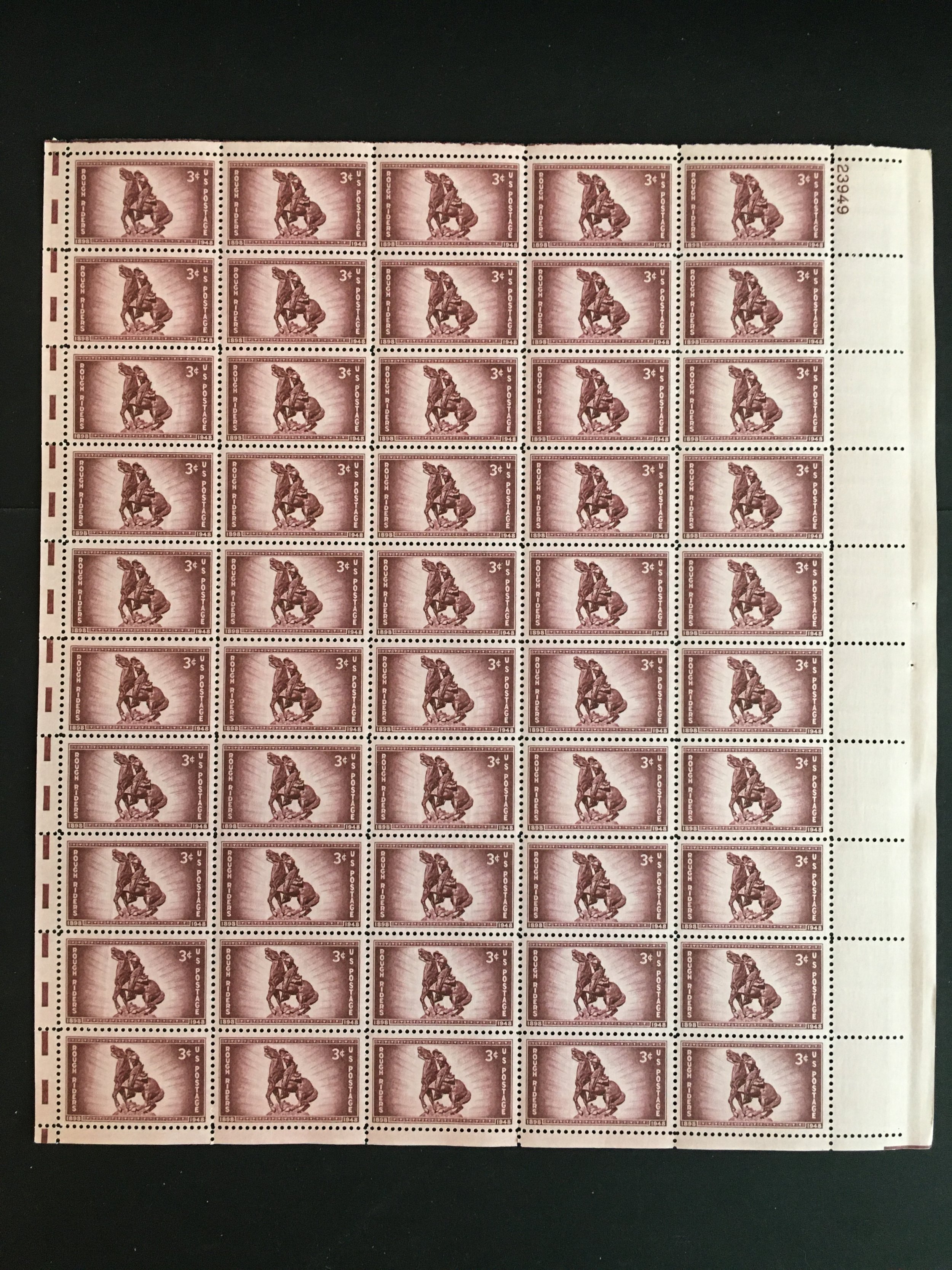 Full mint sheet of 50 - 3 cent stamps issued in 1948 to honor the 50th anniversary of the organization of the Rough Riders of the Spanish-American War. The stamp shows a statue of Captain William O (Bucky) O'Neill by Solon H. Borglum. The picture below shows one of the stamps from the sheet. This sheet is as fresh as the day it was purchased at the post office 70+ years ago and is suitable for framing. If you're a stamp collector, it is Scott # 973. Plate # 23949 UR.For First Class, flat shipping with a stiff cardboard backing for mint sheets I charge a flat rate of $3.00 for items purchased with one payment and sent to US addresses. That covers as many sheets as you win, so bid on several and save on postage. For other items and International addresses, actual postage costs will be charged.