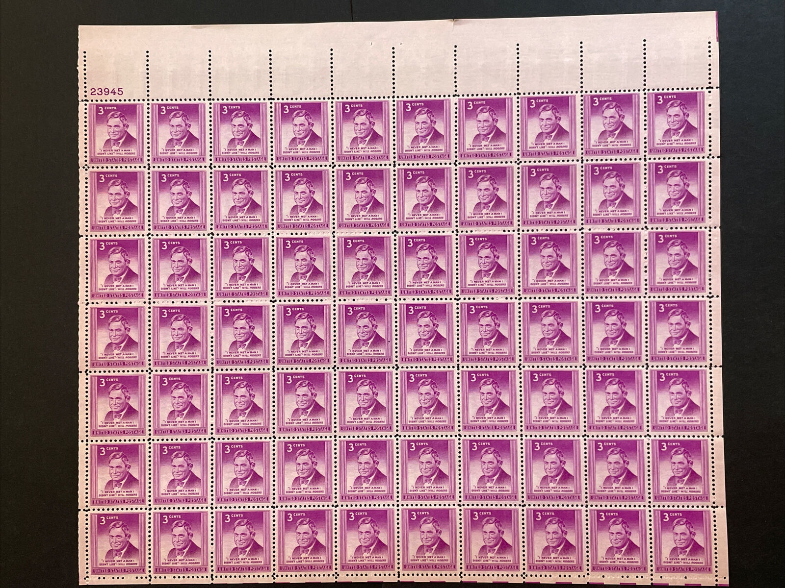 Full mint sheet of 50 - 3 cent stamps issued in 1948 to honor Will Rogers (1879-1935), humorist and political commentator. The stamp shows a portrait of Will Rogers. This sheet is as fresh as the day it was purchased at the post office 70+ years ago and is suitable for framing. If you're a stamp collector, it is Scott # 975. Plate # 23945 UL.For First Class, flat shipping with a stiff cardboard backing for mint sheets I charge a flat rate of $3.00 for items purchased with one payment and sent to US addresses. That covers as many sheets as you win, so bid on several and save on postage. For other items and International addresses, actual postage costs will be charged.