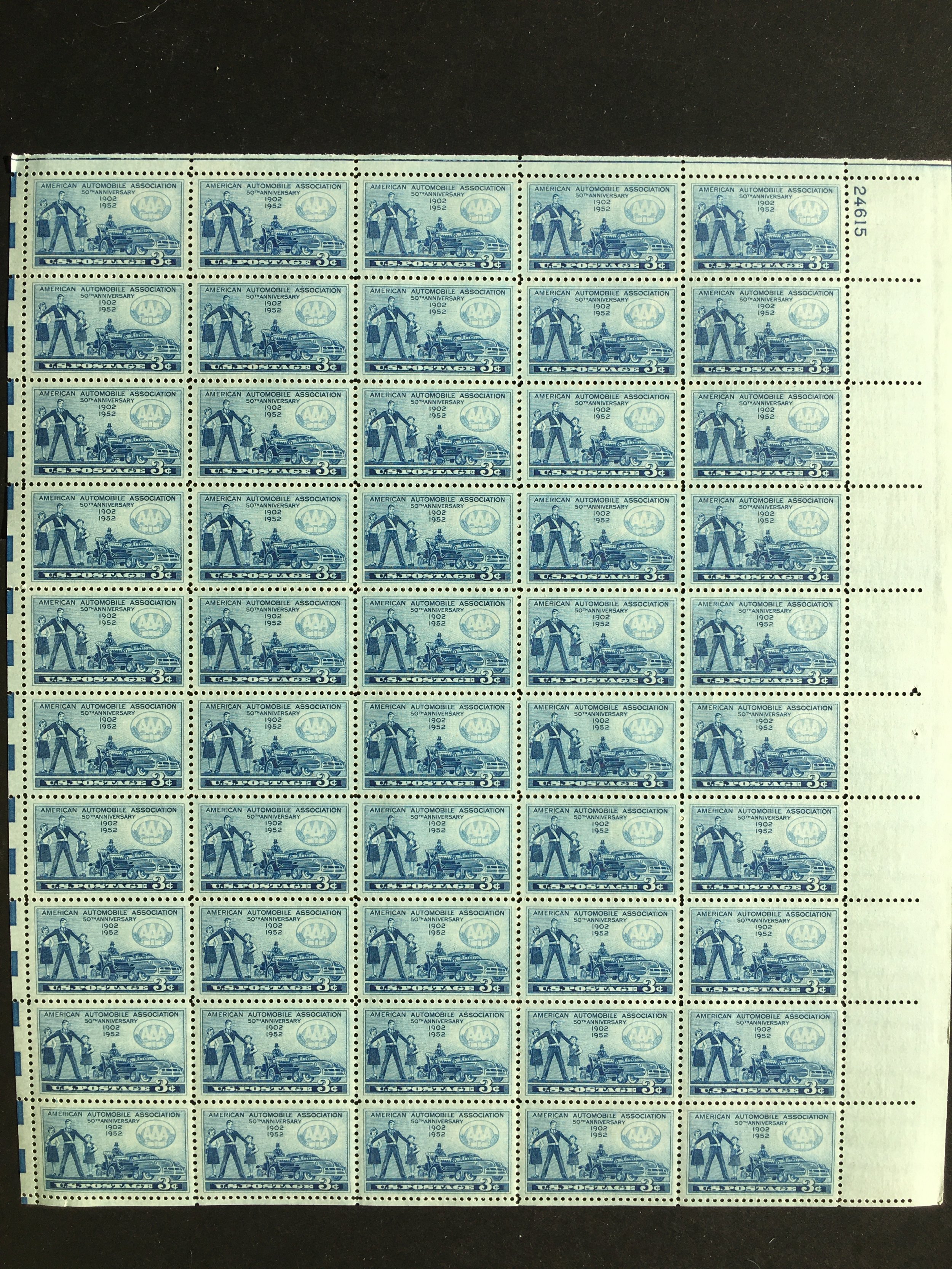 Full mint sheet of 50 - 3 cent stamps issued in 1952 to celebrate the 50th Anniversary of the formation of the American Automobile Association. The stamp shows school girls and Safety Patrolman Automobiles of 1902 and 1952. The picture below shows one of the stamps from the sheet. This sheet is as fresh as the day it was purchased at the post office 65+ years ago and is suitable for framing. If you're a stamp collector, it is Scott #1007. Plate # 24615 UR.For First Class, flat shipping with a stiff cardboard backing for mint sheets I charge a flat rate of $3.00 for items purchased with one payment and sent to US Addresses. That covers as many sheets as you win, so bid on several and save on postage.