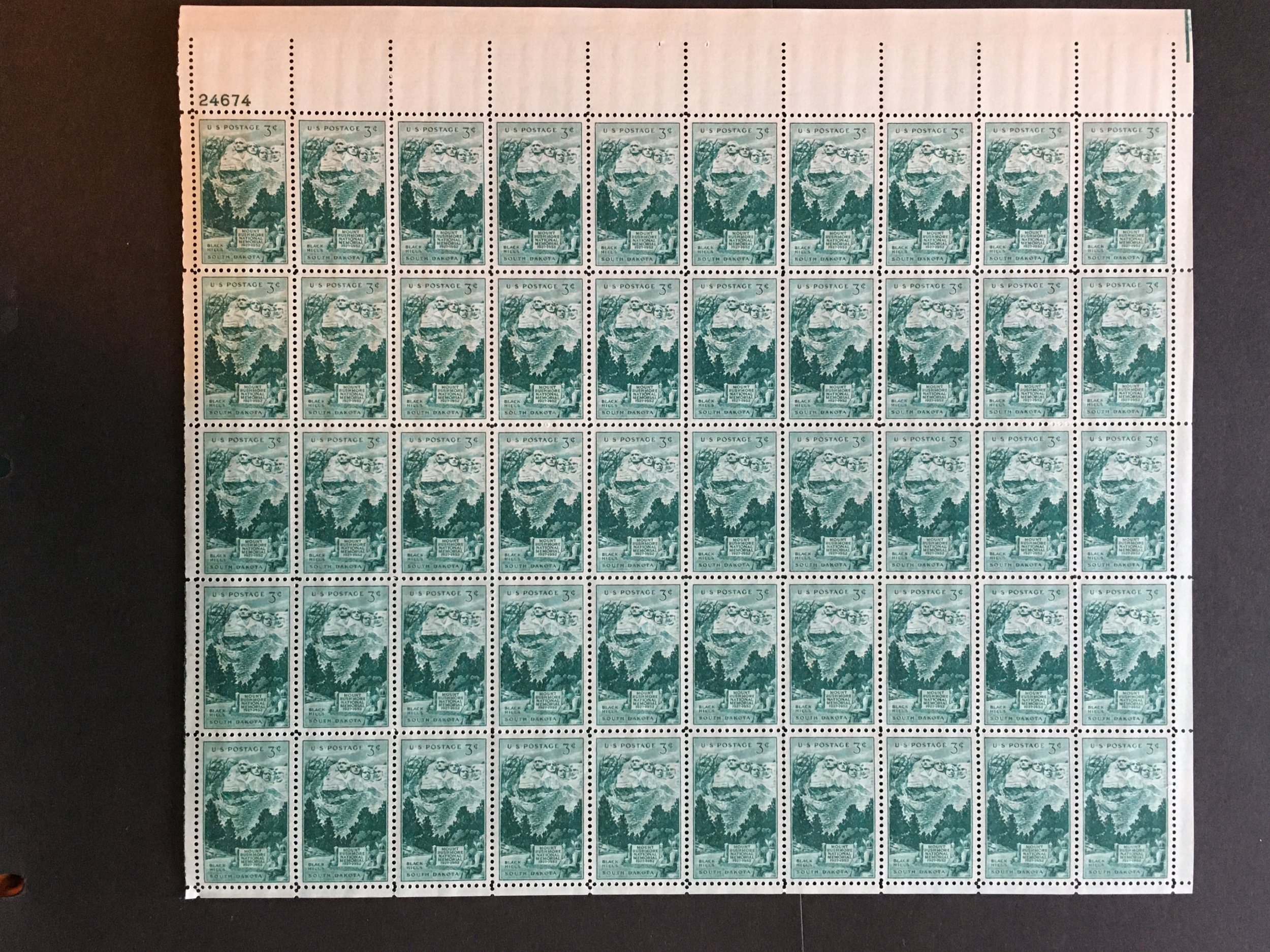 Full mint sheet of 50 - 3 cent stamps issued in 1952 to celebrate the 25th Anniversary of the dedication of the Mt. Rushmore National Memorial in the Black Hills of South Dakota. The stamp shows the Sculptured heads on Mt. Rushmore. The picture below shows one of the stamps from the sheet. This sheet is as fresh as the day it was purchased at the post office 65+ years ago and is suitable for framing. If you're a stamp collector, it is Scott #1011. Plate # 24674 UL.For First Class, flat shipping with a stiff cardboard backing for mint sheets I charge a flat rate of $3.00 for items purchased with one payment and sent to US Addresses. That covers as many sheets as you win, so bid on several and save on postage.