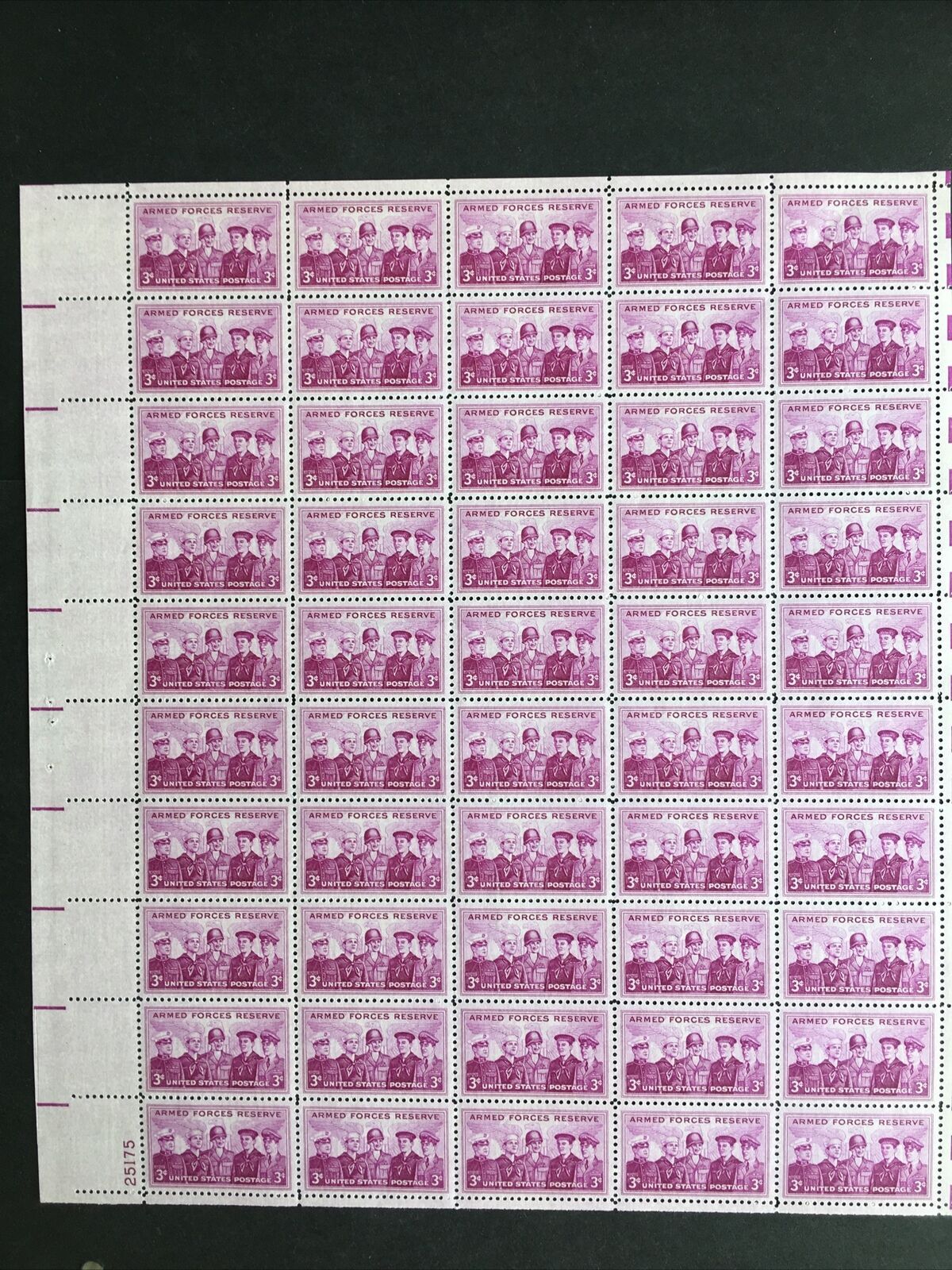 Grade: VF (Very Fine)Full mint sheet of 50 - 3 cent stamps issued in 1955 to honor the Armed Forces Reserve. The stamp shows Marine, Coast Guard, Army, Navy and Air Force Personnel. This sheet is as fresh as the day it was purchased at the post office 65+ years ago and is suitable for framing. If you're a stamp collector, it is Scott # 1067. I may have a variety of plate numbers and positions available so ask if you are looking for something in particular. For First Class, flat shipping with a stiff cardboard backing for mint sheets I charge a flat rate of $4.00 for items purchased with one payment and sent to US Addresses. That covers as many sheets as you win, so bid on several and save on postage.