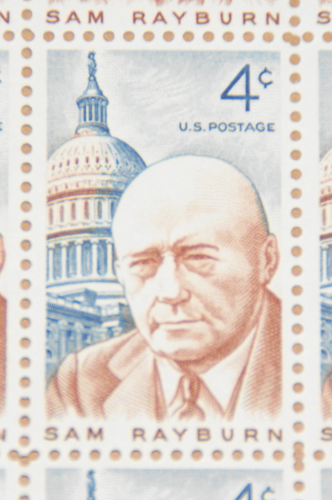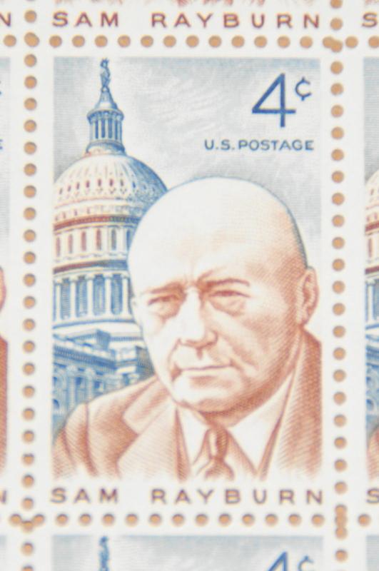Full mint sheet of 50 - 4 cent stamps issued in 1962 to honor Sam Rayburn (1882-1961), Speaker of the House of Representatives. The stamp shows Sam Rayburn and the Capitol. The picture below shows one of the stamps ... Read More