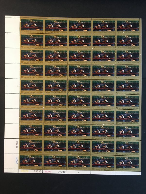 Full mint sheet of 50 - 5 cent stamps issued in 1967 to honor Thomas Eakins, painter and sculptor. The stamp shows one of Eakins' paintings entitled "The Biglin Brothers Racing" (They're sculling on the Schuylkill R ... Read More