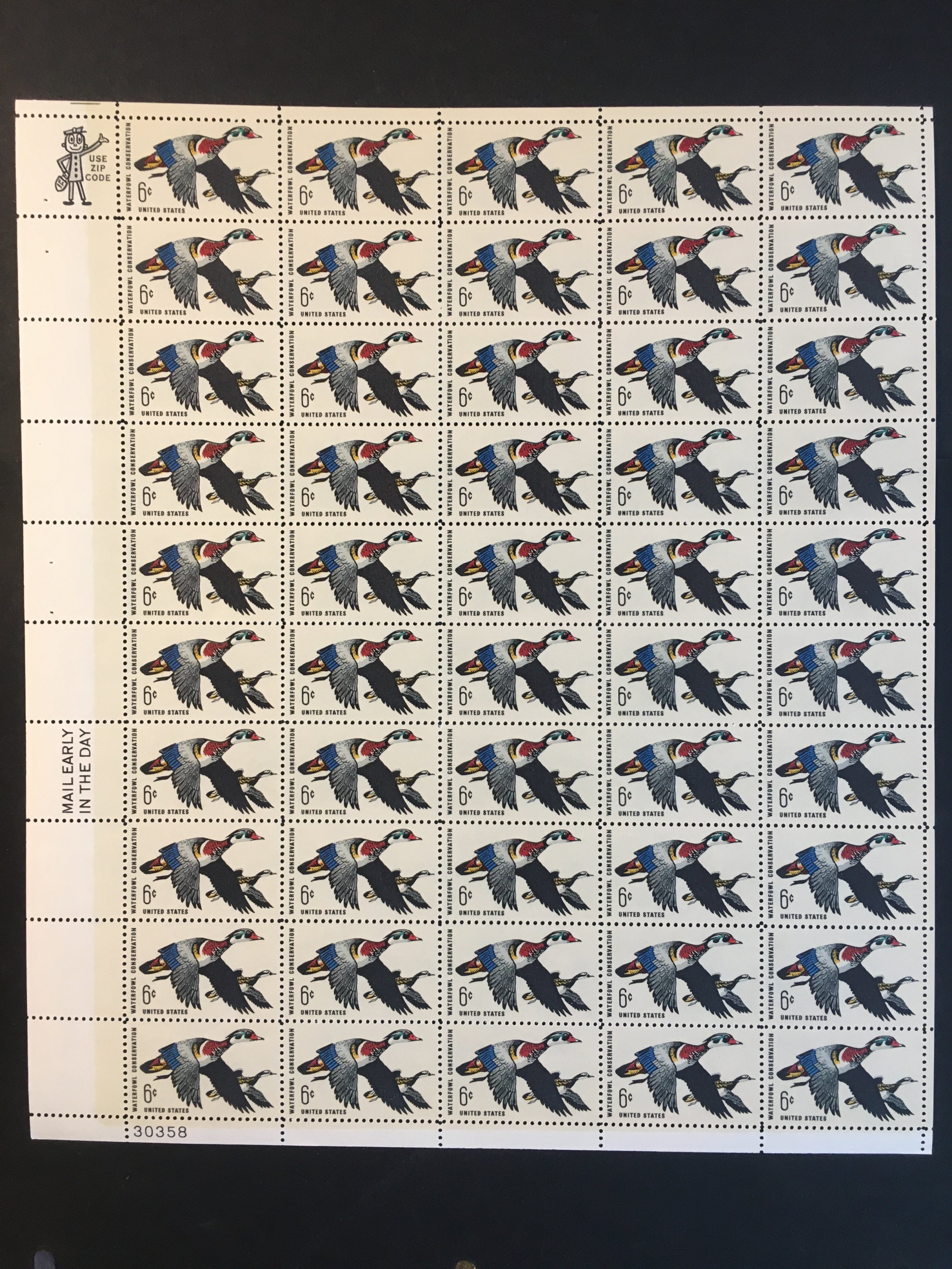 Full mint sheet of 50 - 6 cent stamps issued in 1968 to promote Waterfowl Conservation. The stamp shows Wood Ducks in flight. The picture shows one of the stamps from the sheet. This sheet is as fresh as the day it was purchased at the post office 50+ years ago and is suitable for framing. If you're a stamp collector, it is Scott #1362. Plate #30358 LL.For First Class, flat shipping with a stiff cardboard backing for mint sheets I charge a flat rate of $3.00 for items purchased with one payment and sent to US addresses. That covers as many sheets as you win, so bid on several and save on postage. For other items and International addresses, actual postage costs will be charged.