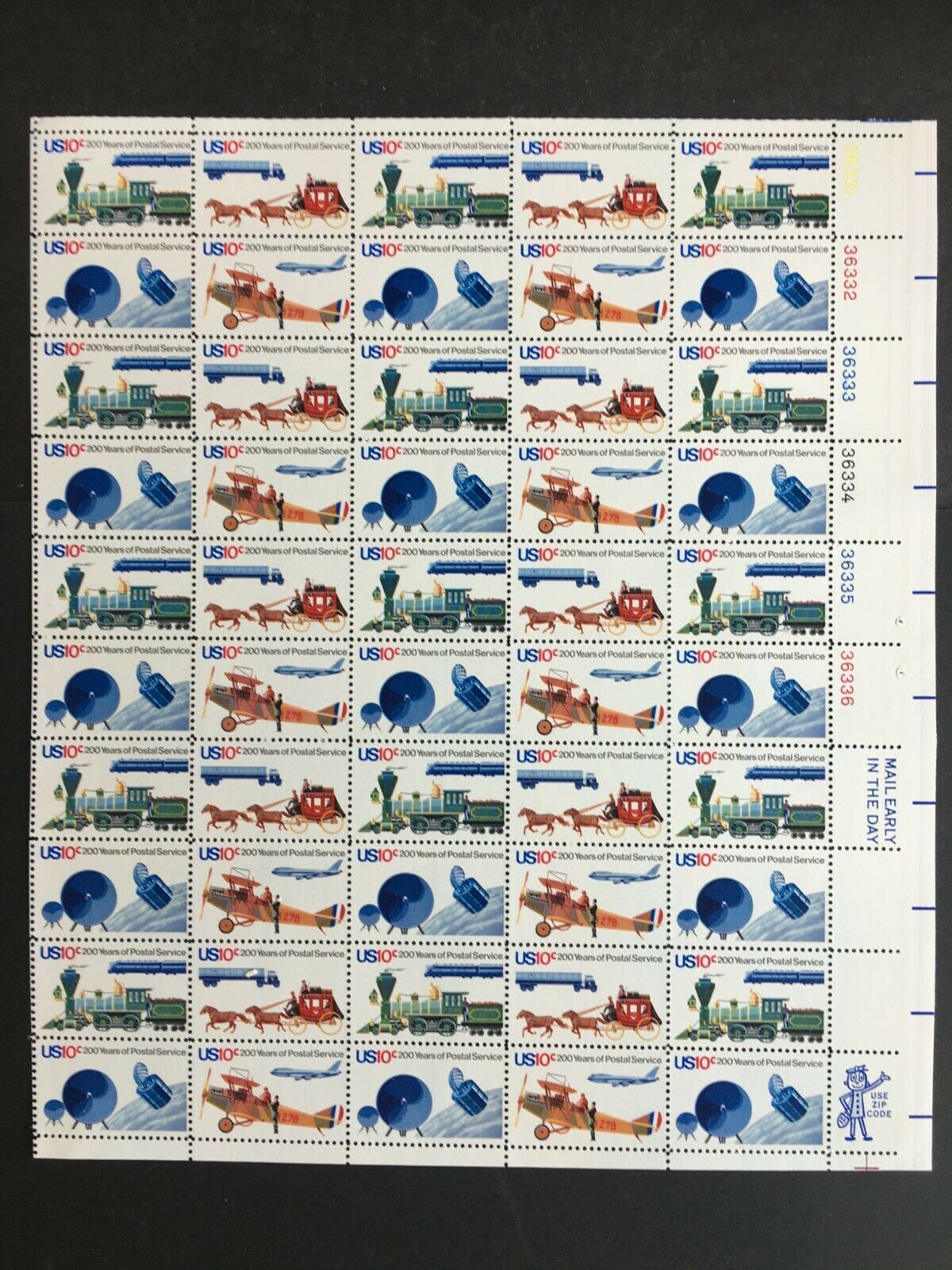 Full mint sheet of 50 - 10 cent stamps issued in 1975 to celebrate the bicentenary of U.S. Postal Service. The 4 different stamps each show a different form of postal transportation. They are: Stagecoach and trailer truck; Old and new Locomotives; an early mail jet and a plane; and a satellite. The picture below shows a block of 4 stamps from the sheet. This sheet is as fresh as the day it was purchased at the post office 45+ years ago and is suitable for framing. If you're a stamp collector, it is Scott #1572-1575. Plate #s 36331-36336 UR.For First Class, flat shipping with a stiff cardboard backing for mint sheets I charge a flat rate of $3.00 for items purchased with one payment and sent to US addresses. That covers as many sheets as you win, so bid on several and save on postage. For other items and International addresses, actual postage costs will be charged.