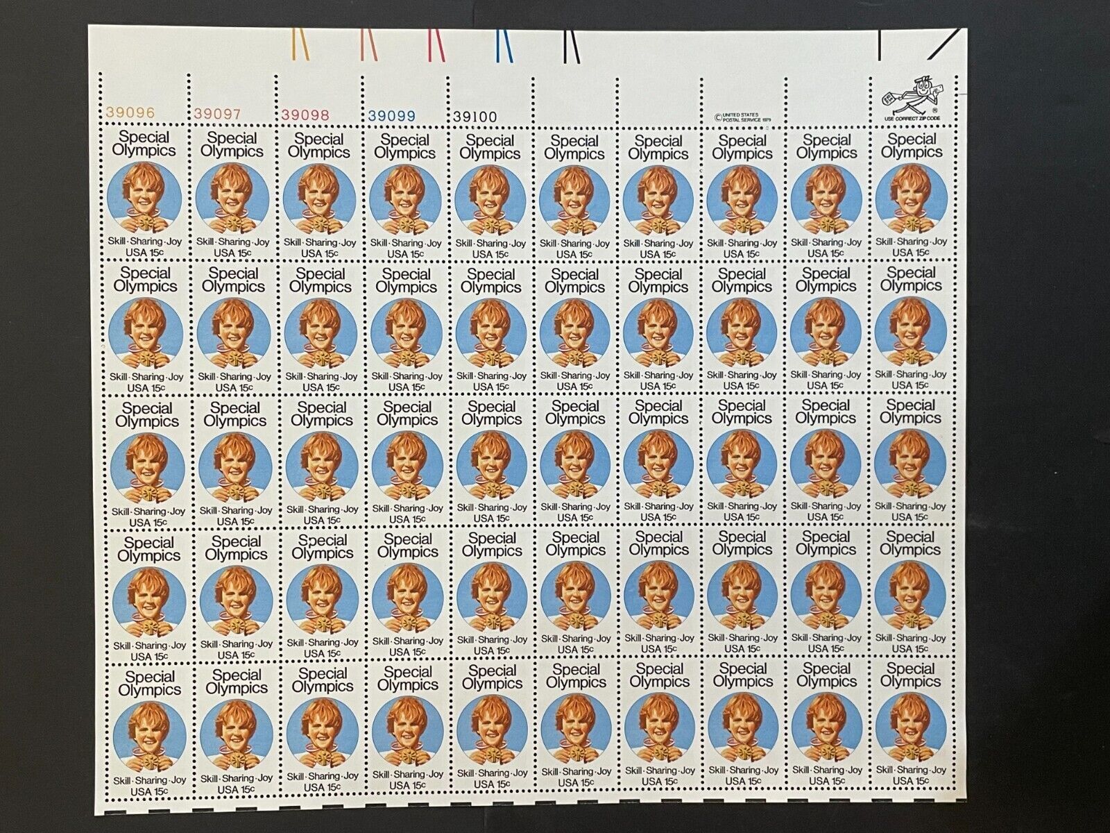 Grade: VF (Very Fine)Full mint sheet of 50 - 15 cent stamps issued in 1979 as a tribute to the Special Olympics. The stamp shows a child holding a winner's medal. The picture below shows the full sheet. This sheet is as fresh as the day it was purchased at the post office 40+ years ago and is suitable for framing. If you're a stamp collector, it is Scott #1788. Plate# 39096-39100 UL.For First Class, flat shipping with a stiff cardboard backing for mint sheets I charge a flat rate of $4.00 for items purchased with one payment and sent to US addresses. That covers as many sheets as you win, so bid on several and save on postage. For other items and International addresses, actual postage costs will be charged.