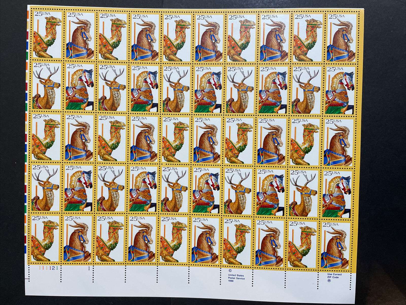 Full mint sheet of 50 - 25 cent stamps issued in 1988 to celebrate American Folk Art. The 4 different stamps depict the following Carousel Animals: Deer, Horse, Camel and Goat. The picture below shows one block of the four different stamps in the sheet. This sheet is as fresh as the day it was purchased from the post office 30+ years ago and is suitable for framing. If you're a stamp collector, it is Scott # 2390-93. I may have a variety of plate numbers and positions available so ask if you are looking for something in particular.For First Class, flat shipping with a stiff cardboard backing for mint sheets I charge a flat rate of $3.00 for items purchased with one payment and sent to US Addresses. That covers as many sheets as you win, so bid on several and save on postage.