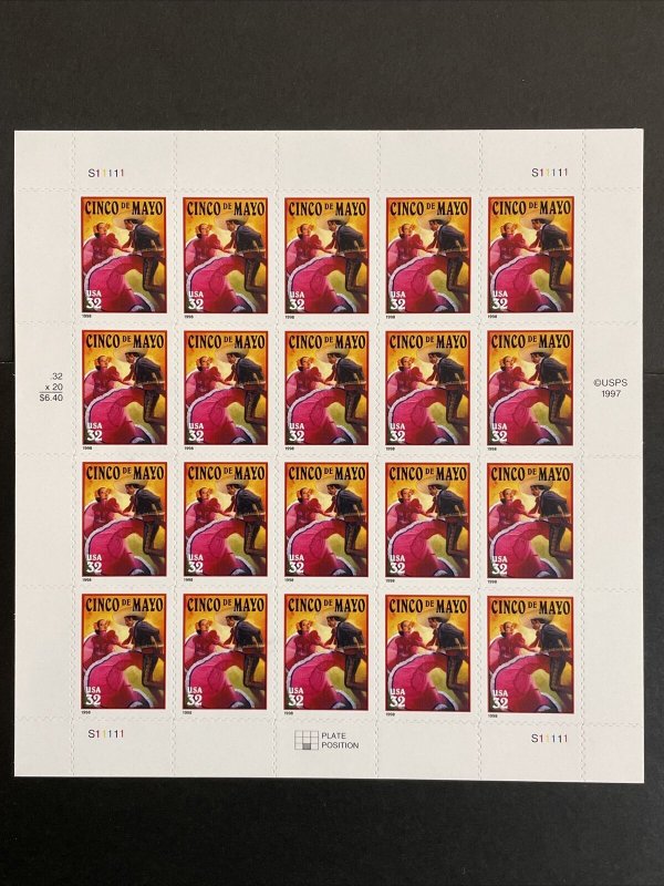 Full mint sheet of 20 - 32 cent self-adhesive stamps issued in 1998 to celebrate Cinco De Mayo. The stamps show two people dancing. The picture below shows an example of a stamp from the sheet. This sheet is as fresh as the day it was purchased from the post office 20+ years ago and is suitable for framing. If you're a stamp collector, it is Scott # 3203 plate # S11111 in all four corners.For First Class, flat shipping with a stiff cardboard backing for mint sheets I charge a flat rate of $3.00 for items purchased with one payment and sent to US Addresses. That covers as many sheets as you win, so bid on several and save on postage.
