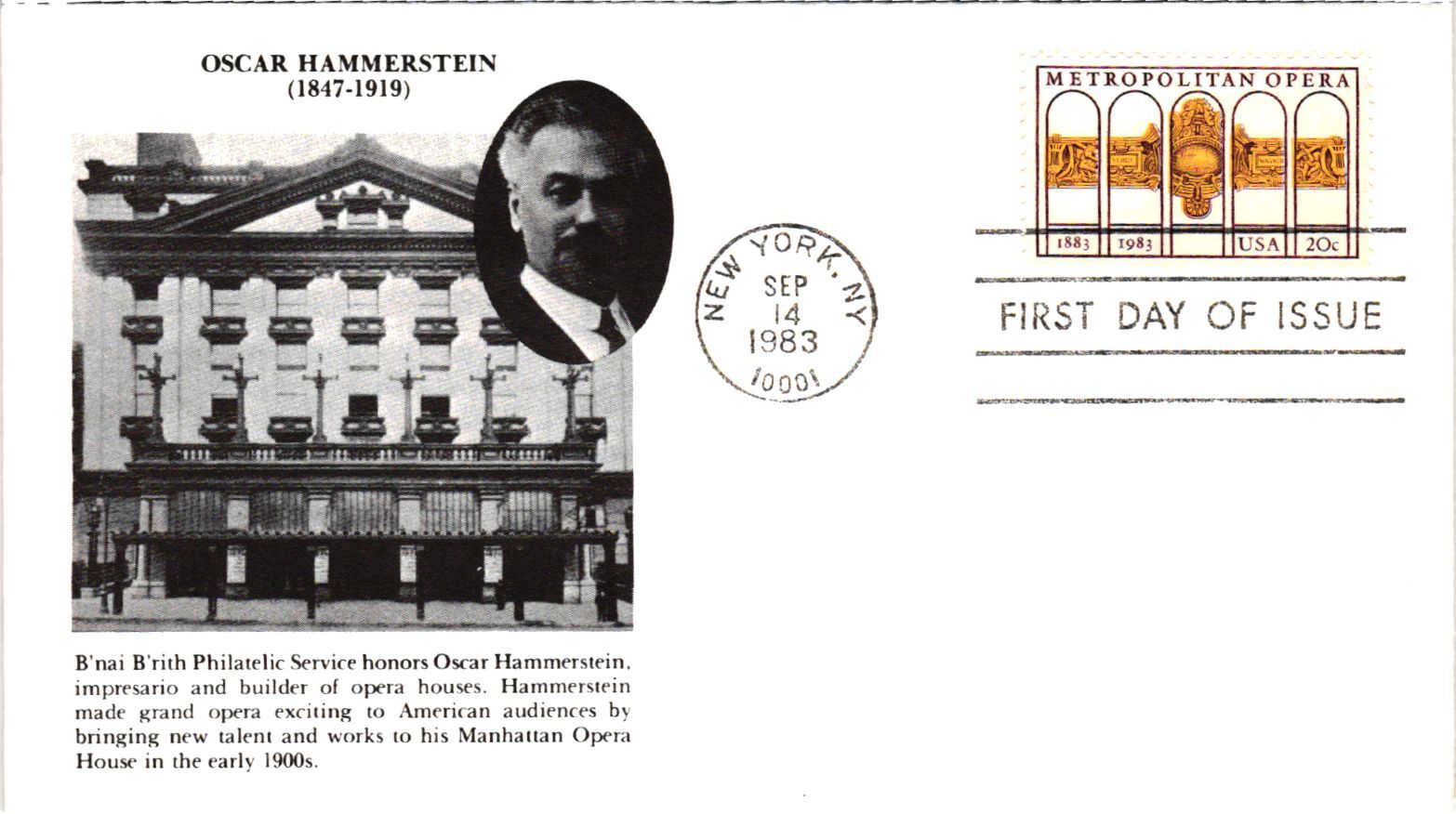 #2054 Metropolitan Opera– B’nai B’rith Cachet – Judaica – May include insert – zoom in for condition