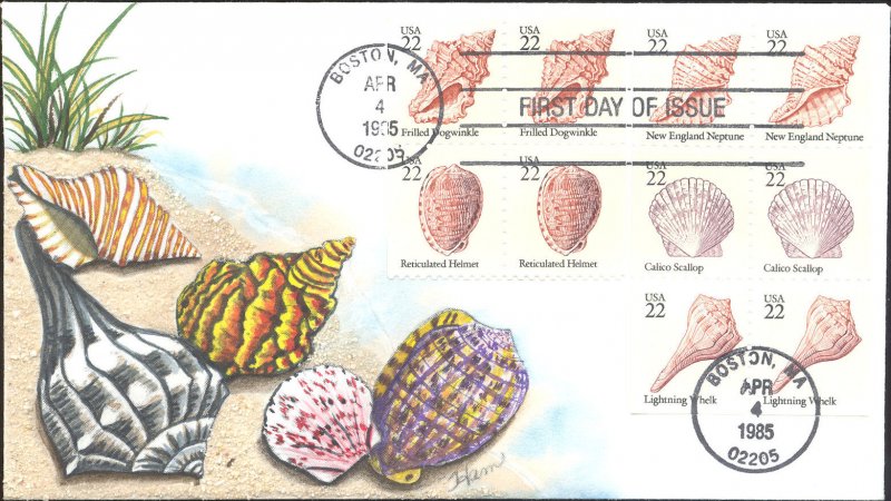 #2117-21 Seashells first day cover by Lois Hamilton. Postmark State: MA City: Boston Year: 1985 Month: 4 Day: 4