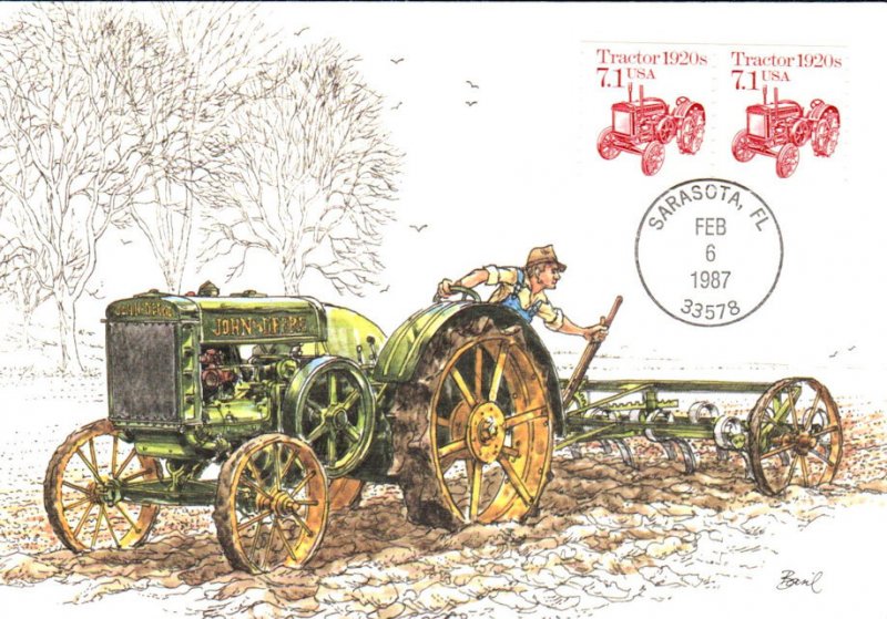 #2127 Tractor 1920s first day maximum card by Fleetwood. The lower right corner is creased. Postmark State: FL City: Sarasota Year: 1987 Month: 2 Day: 6