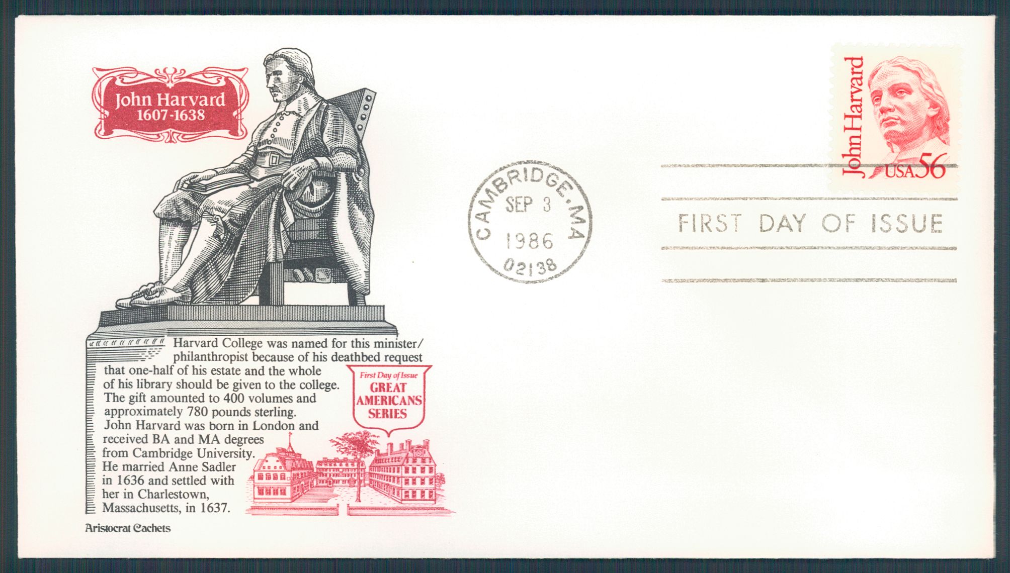 #2190 John Harvard - Great Americans -Aristocrat Cachet...