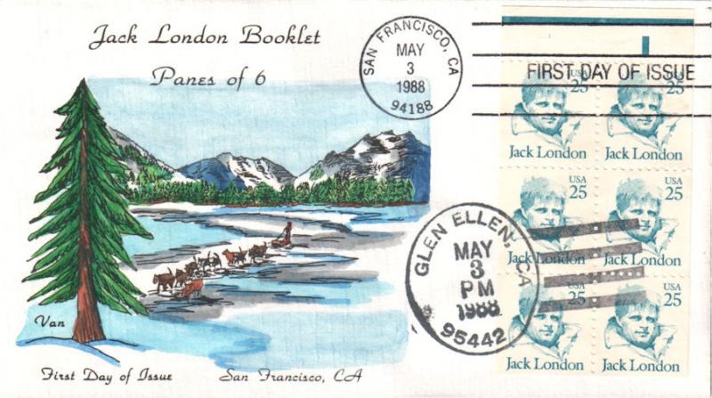 #2197 Jack London first day cover by George Van Natta. The edges are toned. Postmark State: CA City: San Francisco Year: 1988 Month: 5 Day: 3 Postmark State: CA City: Glen Ellen Year: 1988 Month: 5 Day: 3Seller Information