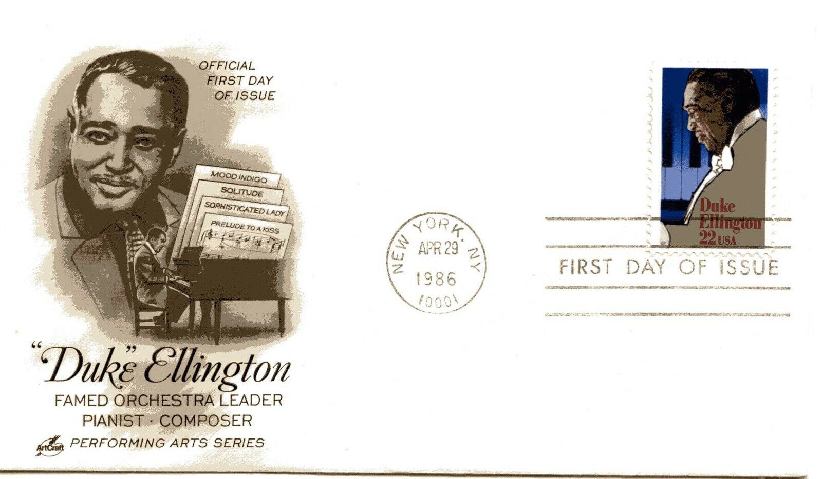 Grade: VF (Very Fine)#2211 22c "Duke" Ellington, the ninth in the Performing Arts series, ArtCraft, unaddressed, first day cover, Apr 20, 1986, New York, NY.The scan is a typical cover. Combine purchases and save on shipping & handling charges. Powered by Hip Turbo ListerThe free listing tool. List your items fast and easy and manage your active items.