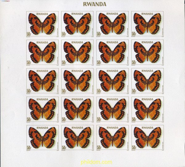 Ref.SEG-E-221903 MNH RUANDA 1979 MARIPOSASExtraordinaria mini hoja de 25 sellos (50f). Variedad, mariposa sin antenas. Sin dentar.