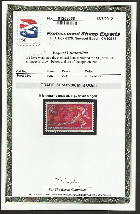51410 33 # 2247 mint never hinged pan american games p.S.E. Grade 98 cert # 01258056 unfolded certificate, and on origianal p.S.E. Stock card.