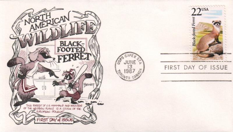 #2333 Black-footed Ferret - American Wildlife first day cover by Dave Bennett Cachetoons. The wildlife series is the 1st commercial Cachetoons cover produced. Postmark State: City: Toronto Canada Year: 1987 Month: 6 Day: 13Seller Information