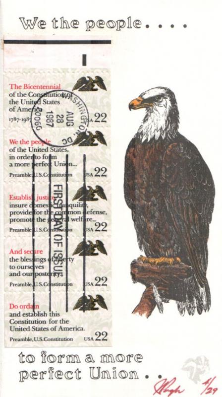 #2355-59 Drafting of the Constitution first day cover by Julian and Sharon Pugh. This cover is #4 of 29. A copy of Pugh's information sheet is included. Postmark State: DC City: Washington Year: 1987 Month: 8 Day: 28Seller Information