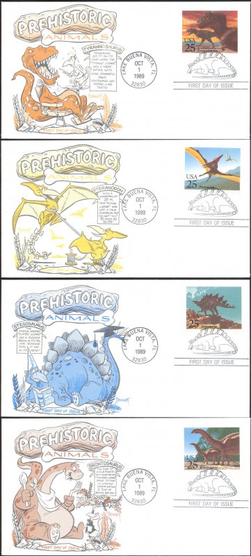 #2422-25 Prehistoric Animals - Dinosaurs first day cover by Dave Bennett Cachetoons. The lower left side of #2425 is smudged. Postmark State: FL City: Lake Buena Vista Year: 1989 Month: 10 Day: 1Seller Information