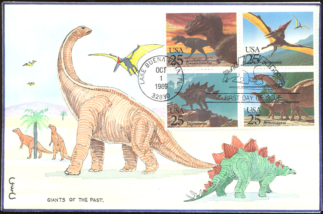 #2422-25 Prehistoric Animals - Dinosaurs first day cover by C and C. Postmark State: FL City: Lake Buena Vista Year: 1989 Month: 10 Day: 1