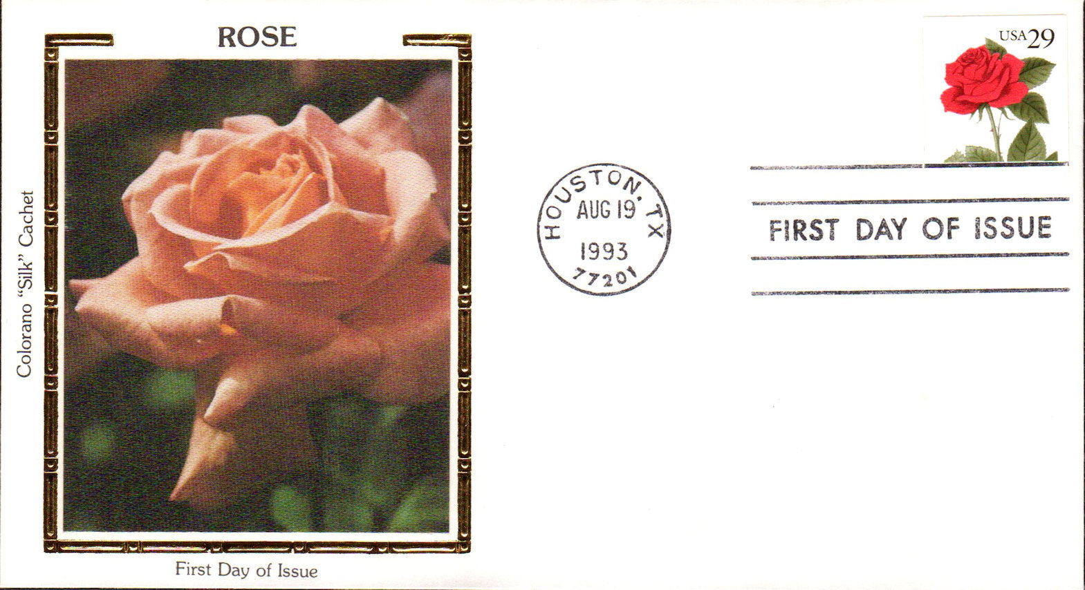 #2490 Red Rose first day cover by Colorano. The upper edge is creased. Postmark State: TX City: Houston Year: 1993 Month: 8 Day: 19