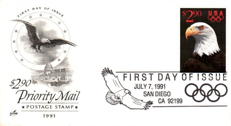 #2540 Bald Eagle first day cover by Artcraft. The lower right corner is creased and smudged and there is some creasing to the left of the stamp. Postmark State: CA City: San Diego Year: 1991 Month: 7 Day: 7