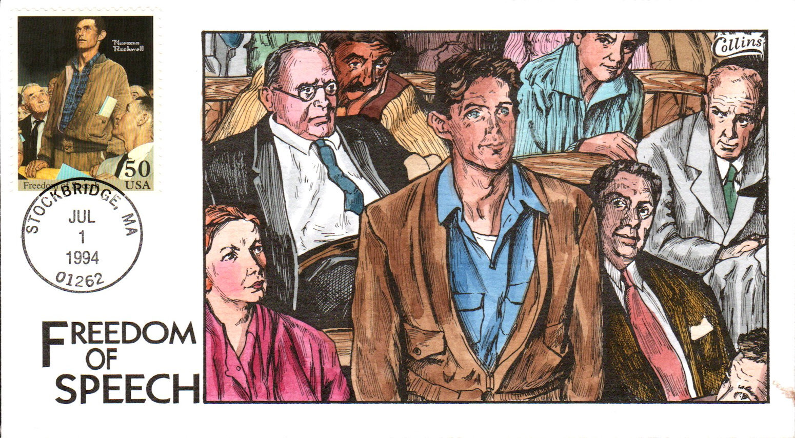 #2840c Freedom of Speech - Norman Rockwell first day cover by Fred Collins. There is paint smudging on the lower right edge. Postmark State: MA City: Stockbridge Year: 1994 Month: 7 Day: 1Seller Information