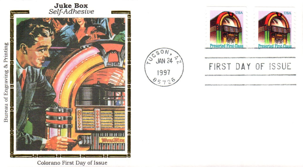 #2912B Juke Box Silk first day cover by Colorano. There edges are creased and there is creasing below the postmark and Scott number and price are written on the reverse. Postmark State: AZ City: Tucson Year: 1997 Month: 1 Day: 24Seller Information