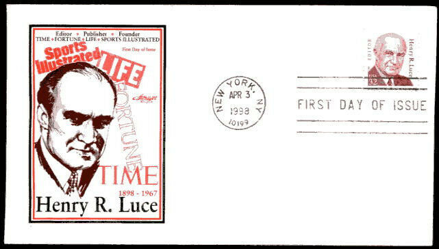 #2935 32c Henry R. Luce, in the Great American series, Artmaster, unaddressed, first day cover, Apr 3, 1998, New York, NY. Magazine founder and editor.The scan is a typical cover. Combine your purchases with one payment and save on shipping & handing charges. Powered by Hip Turbo ListerSeller Information