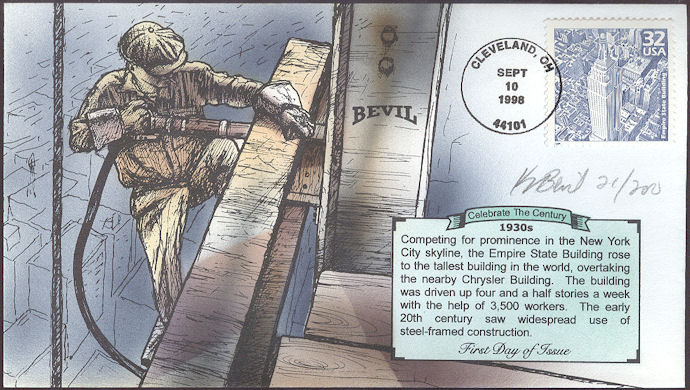 #3185b Empire State Building - Celebrate the Century first day cover by Kendal Bevil. This cover is #21 of 200. Postmark State: OH City: Cleveland Year: 1998 Month: 9 Day: 10