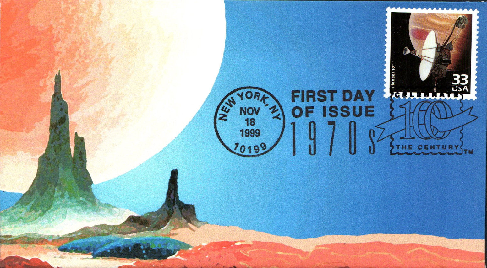 #3189i Pioneer 10 - Celebrate the Century first day cover by Heritage Cachets. The upper right corner is creased. Postmark State: NY City: New York Year: 1999 Month: 11 Day: 18