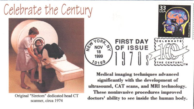 #3189o Medical Imaging - Celebrate the Century first day cover by RRAGS. The upper edge and corners are creased and smudged. Postmark State: NY City: New York Year: 1999 Month: 11 Day: 18