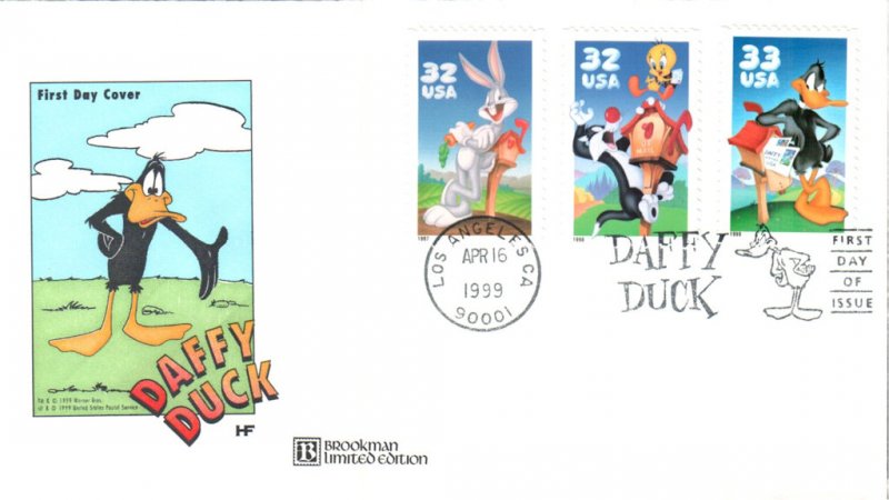 #3306 Daffy Duck first day cover by House of Farnam - Brookman variety. There is significant creasing to the left of the stamps and the lower right edge is creased. Postmark State: CA City: Los Angeles Year: 1999 Month: 4 Day: 16Seller Information
